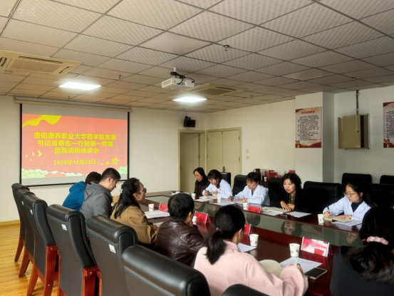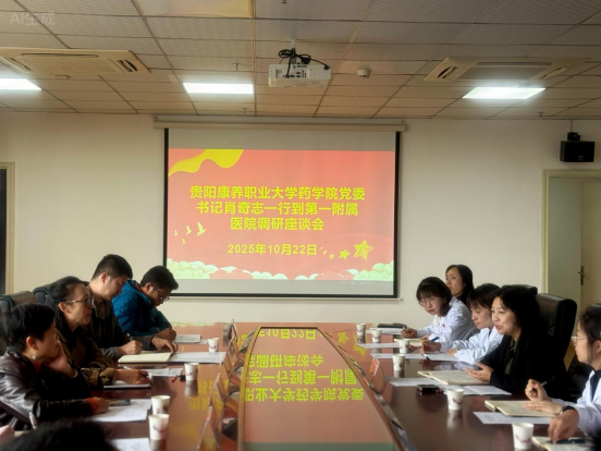 2025年10月22日下午,学院党委书记肖奇志带领学院教师代表,与贵州省药用资源康养产品工程研究中心主任夏忠玉、学校实验实训中心主任陈庄元一行,前往我校附属医院(贵阳市第三人民医院),与副院长陈琳,党办、药剂科、医务科、科教科等科室负责人,进行调研座谈。